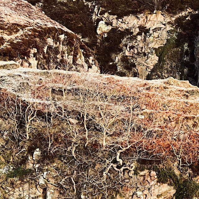 The light plays on the hills and track to the stone beach and picks out the stark trunks of trees clinging to the cliffs.There are some gorgeous Scottish ponies etc in the village - I love their regal sturdy scraggy look.