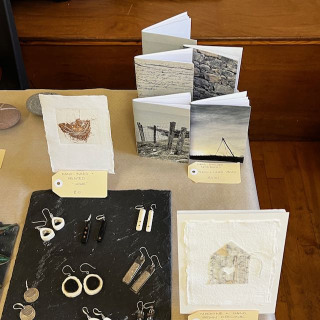 Our table at the Murkle market was very similar to that at Watten - but fortunately the visitors were different. The photo below shows another stall holder who was interested to hear the recycling story behind my work.