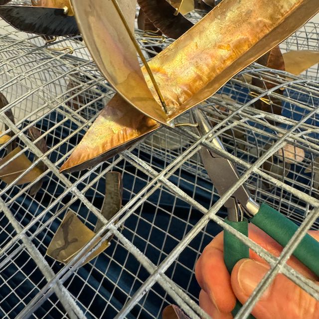 The main issues were that in reattaching some of the boats two layers of a couple of the waves were attached to each other (see photo above) and didn't allow the open rolling sense of the waves; some big stones were dominating the front of the piece; and in places the groups of boats were a bit dense. Using curved jewellery pliers Fiona I removed a number of boats; separated the wire; reattached boats; moved stones; and reformed a couple of waves. Following photos taken by Fiona reflect part of the tweaking process.