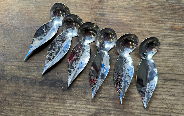 The objects have had the back of their bowl sections planished on metal stakes; all edges ground and leaves and bowls shaped; and the pieces given three polishing - two by wheel (one brass wire wheel) and one by hand. They are now ready for their swing tags and market.